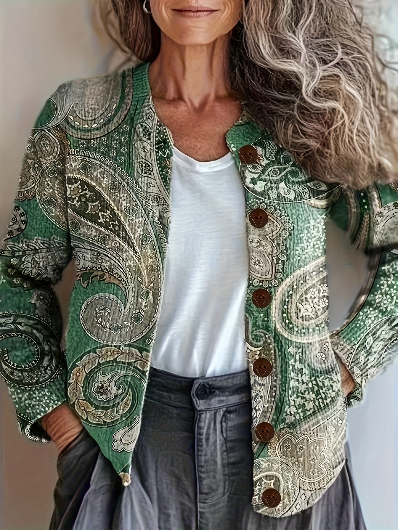 Plus Size - Elegant 2D Printed Geometric Pattern Cardigan - Cozy Fall/Winter Sweater with Button Details, Stretchy Fabric, Long Sleeve, Round Neck, Autumn Winter Apparel | Stylish Cardigan | Constructi