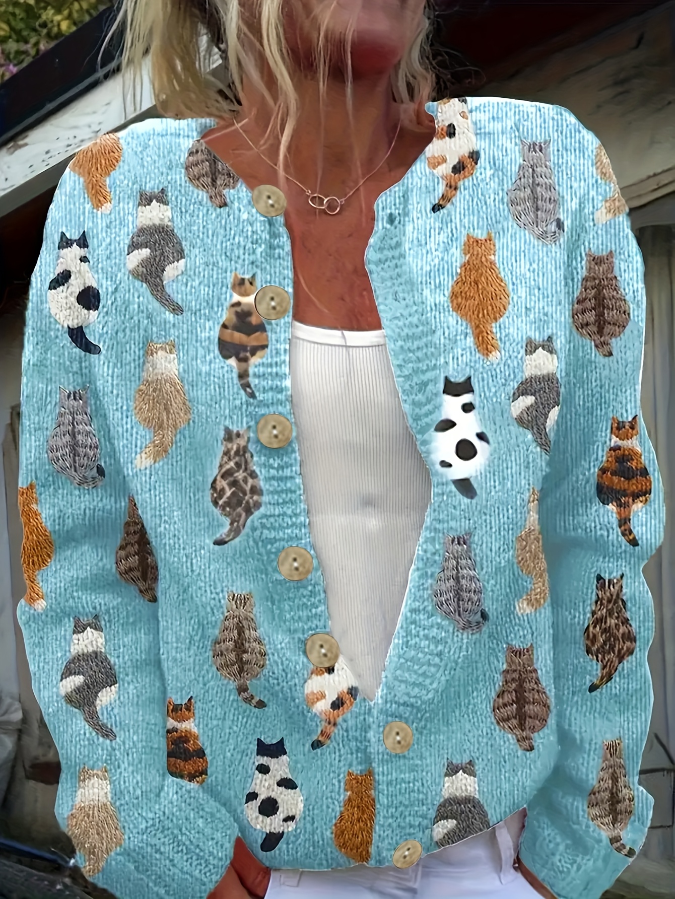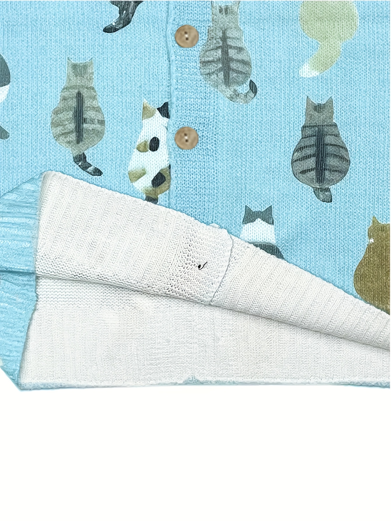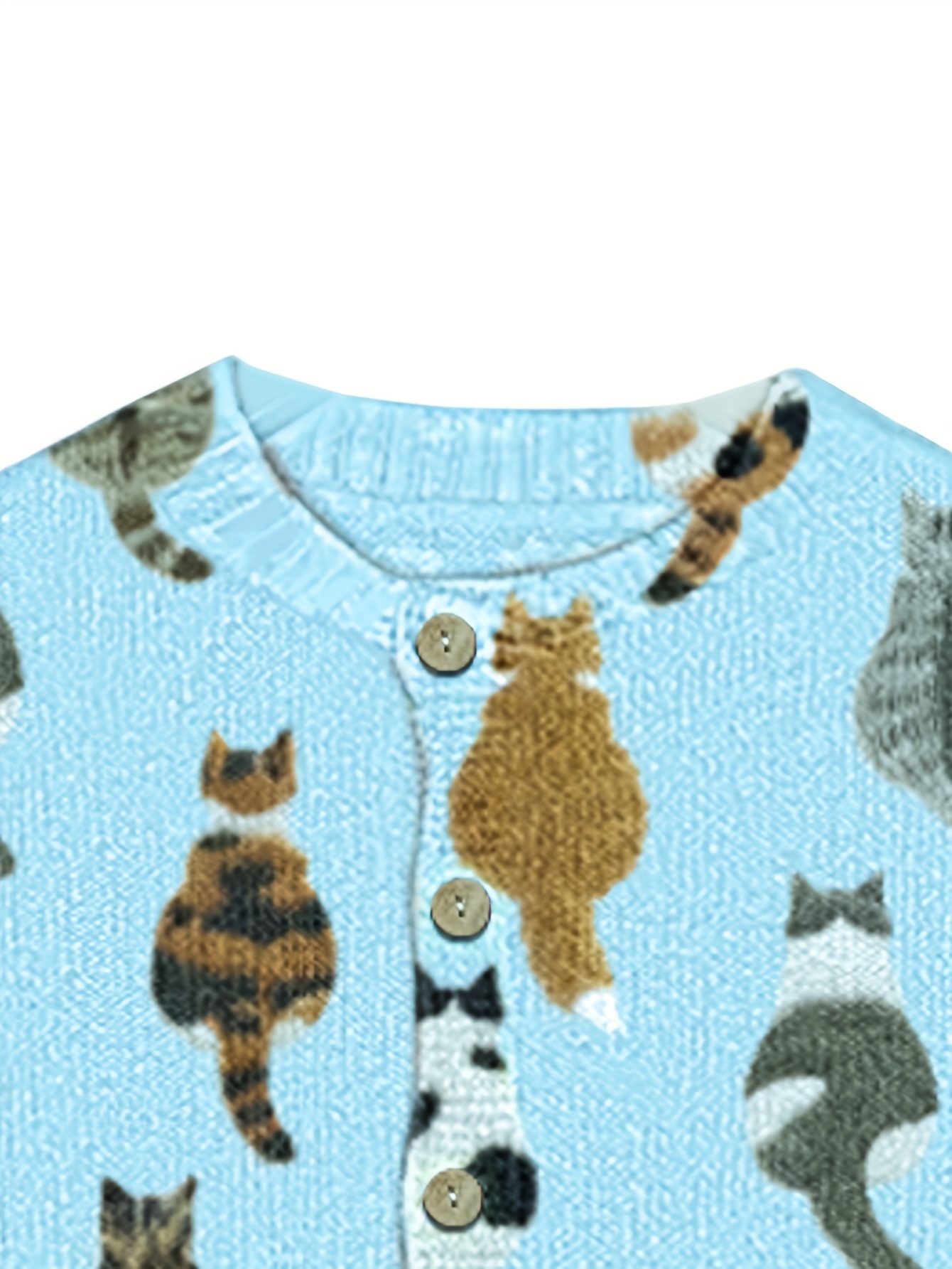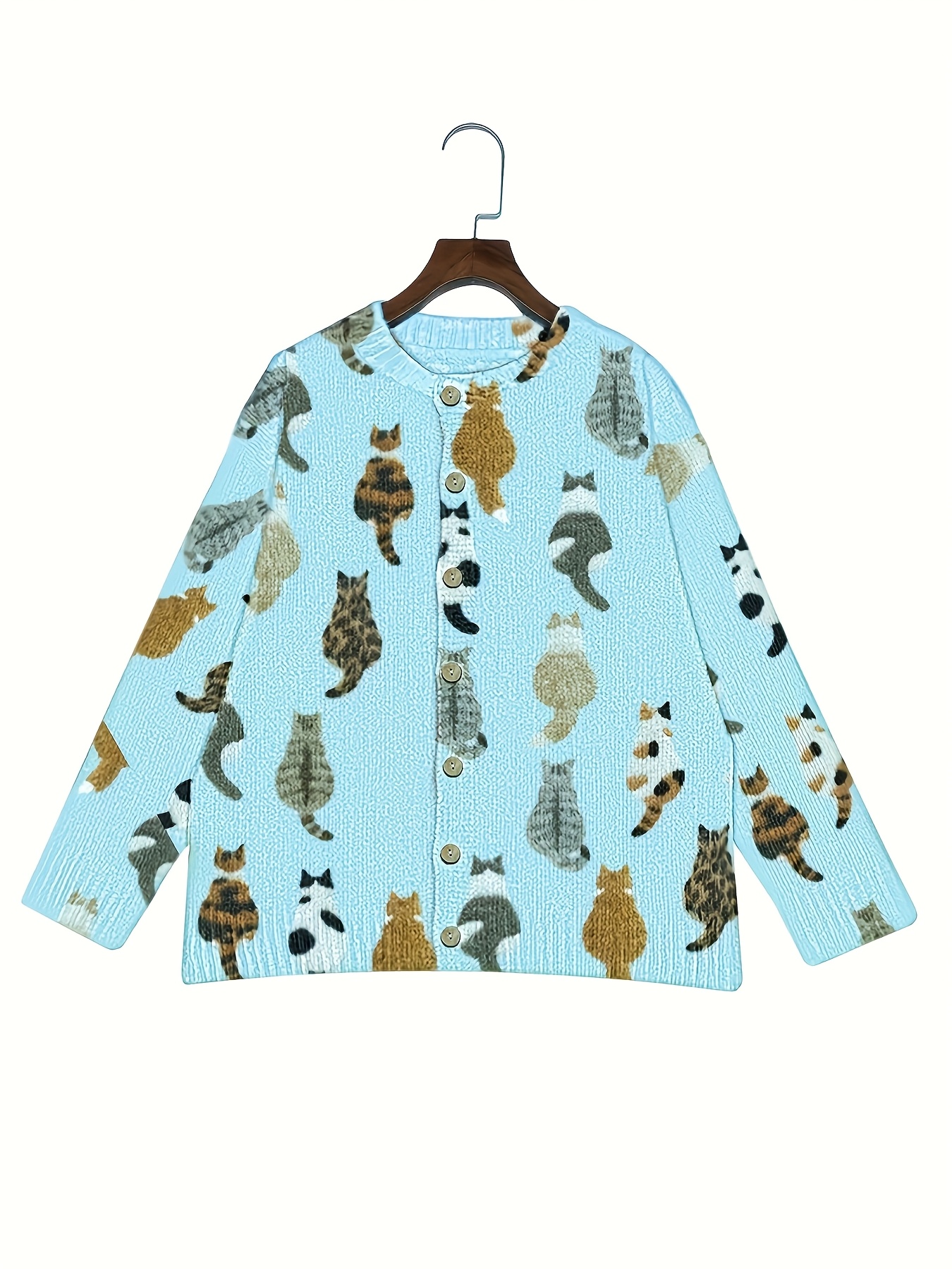 Four-Season Blue Cat Print Long Sleeve Round Neck Cardigan for Women, Casual Fashion