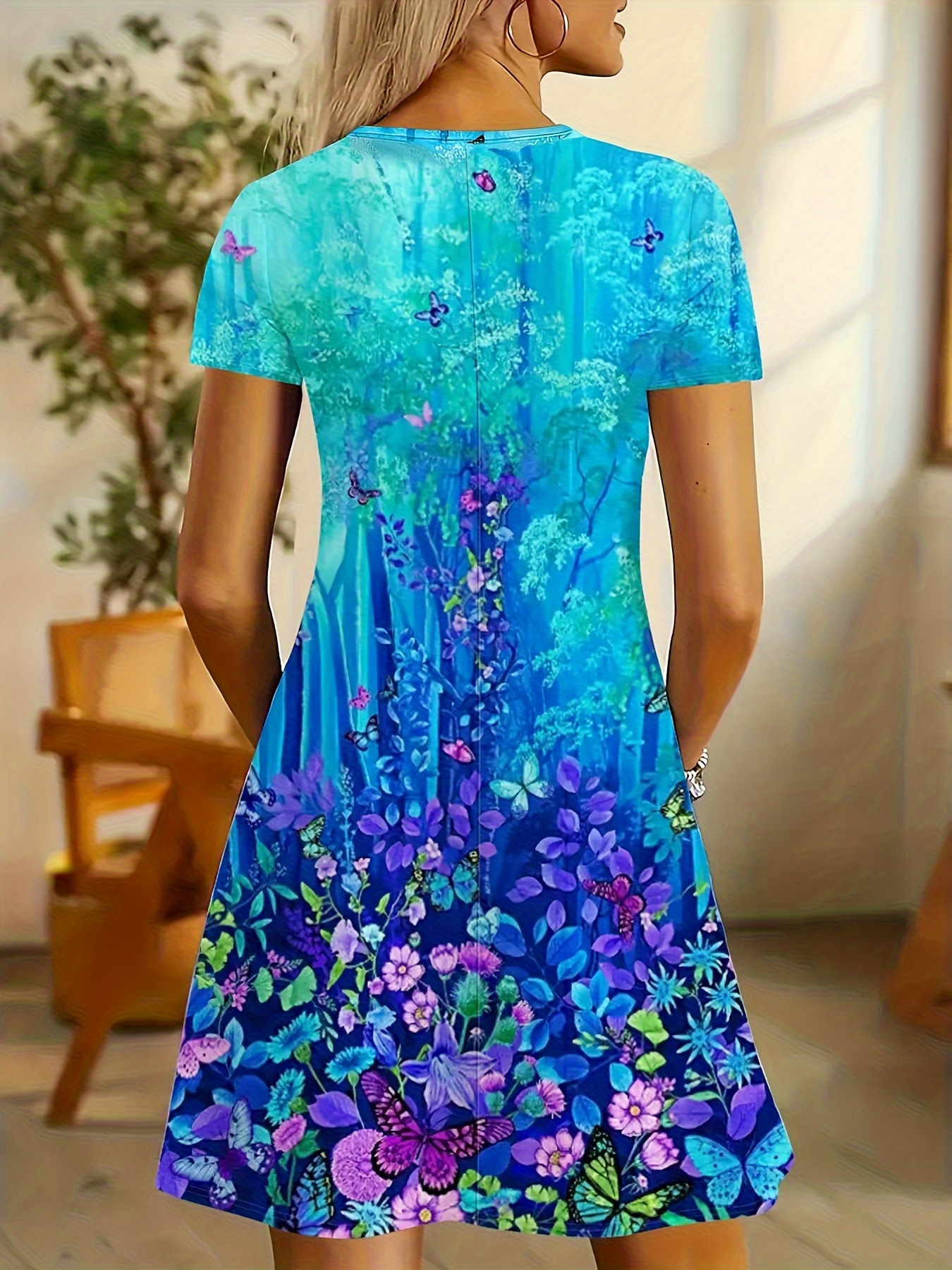 [Overseas Printing]Plus Size Women'S Vibrant Print Dress- Casual Short Sleeve, Stretch Polyester Blend, Washable- Spring/Summer Essential
