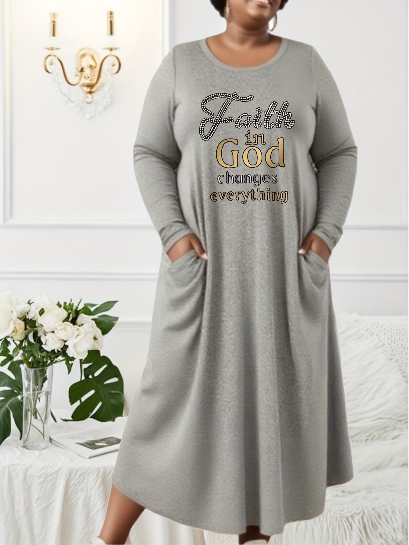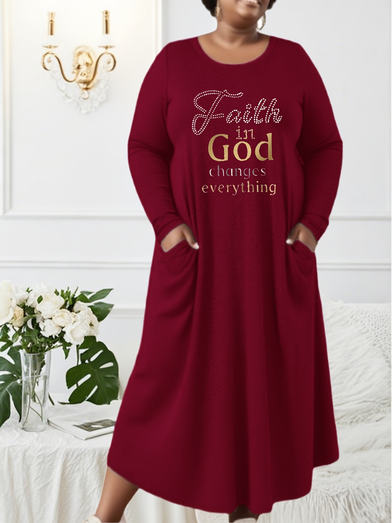 Women's Plus Size Long Maxi Dress with Faith In God Changes Everything - Maroon Religious Dress, Machine Washable Church Outfit, Loose Fit Fall Winter Formal & Casual Wear, Faithbased Apparel, Elegant Longsleeve Design, Comfortable Fabric
