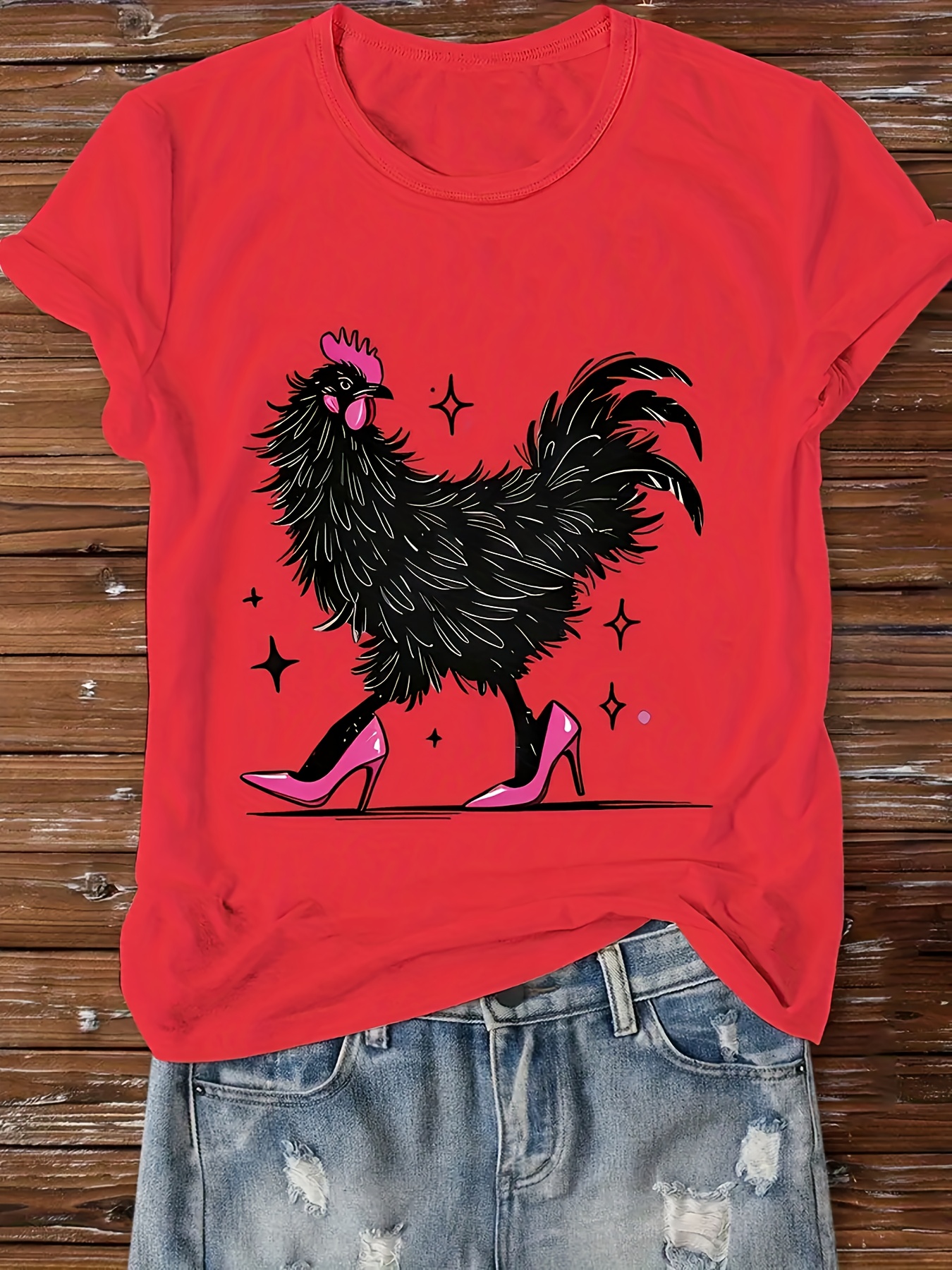 Women'S Red Cartoon Rooster & Stars Print T-Shirt - Loose Fit Crew Neck Short Sleeve, Breathable Summer Top with & Pink Rooster Design, Casual & Party Wear, Machine Washable Soft Everyday Shirt for Women