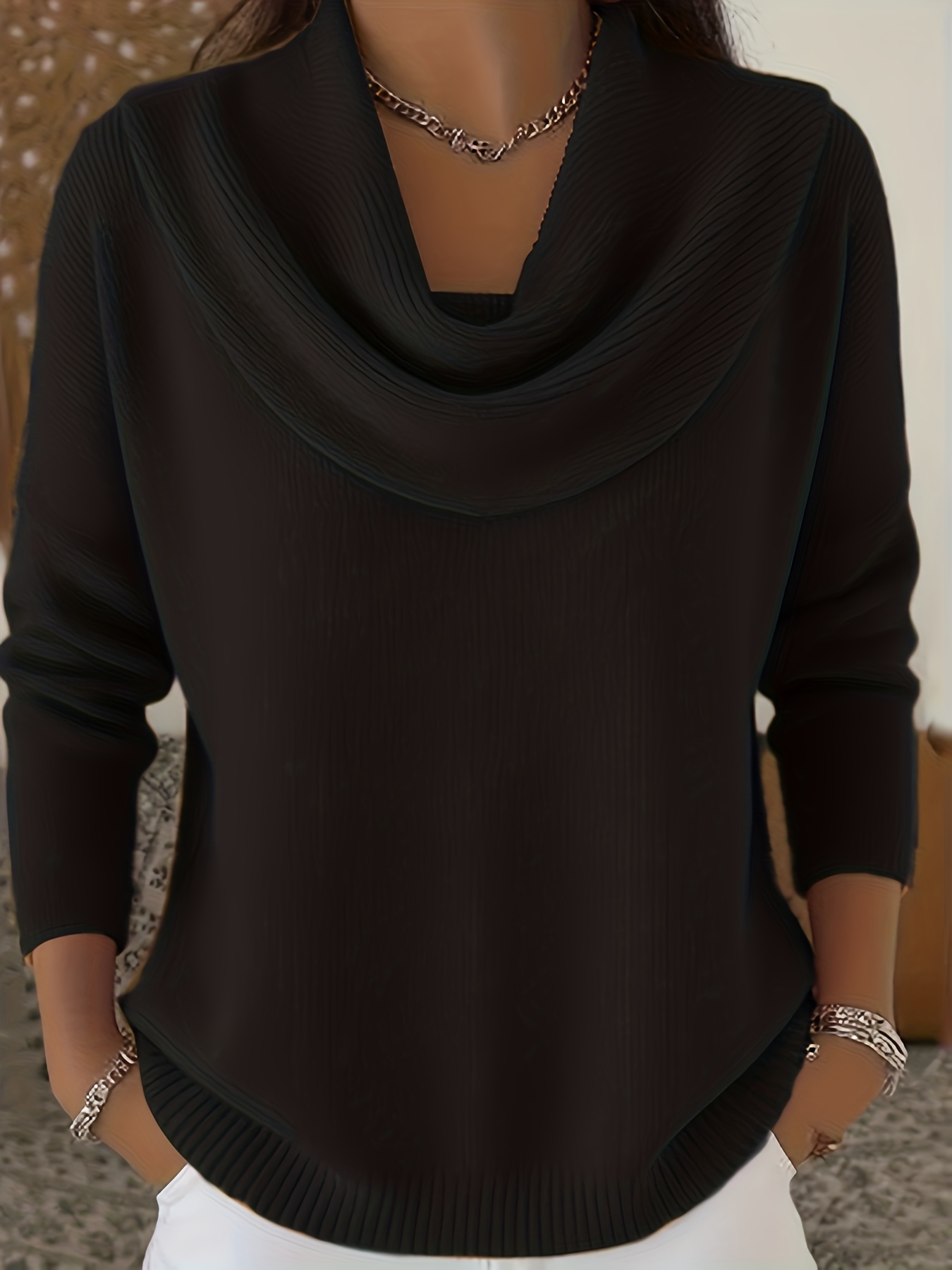 Christmas Green Elegant Long Sleeve Cowl Neck Sweater - Solid Color Minimalist Top, Women'S Winter Warm Pullover