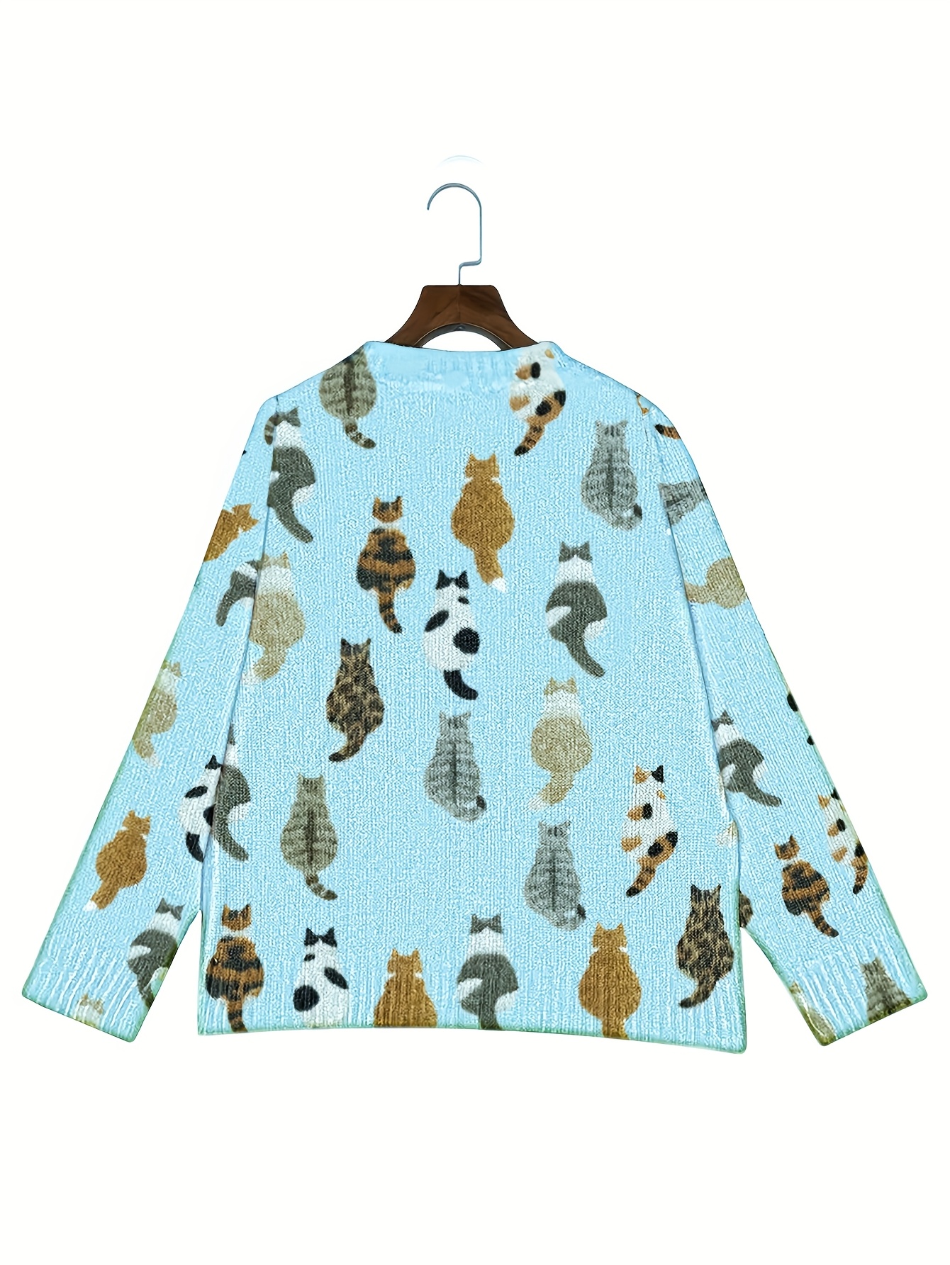 Four-Season Blue Cat Print Long Sleeve Round Neck Cardigan for Women, Casual Fashion