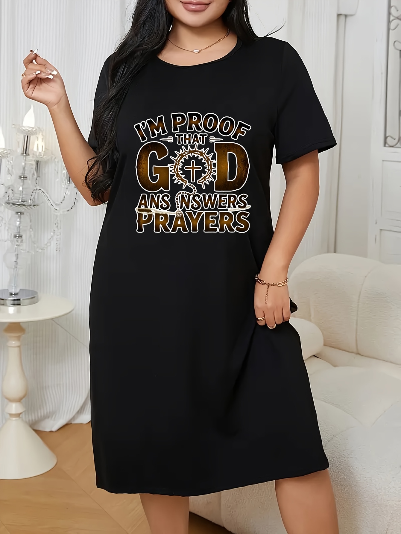 Plus Size Women's Faith Dress - 100% Breathable Short Sleeve A-Line Dress with "I'm Proof That God Answers Prayers" Print & Praying Hands Symbol - Casual Church Outfits, Casual Attire, Loose Fit Summer Dress