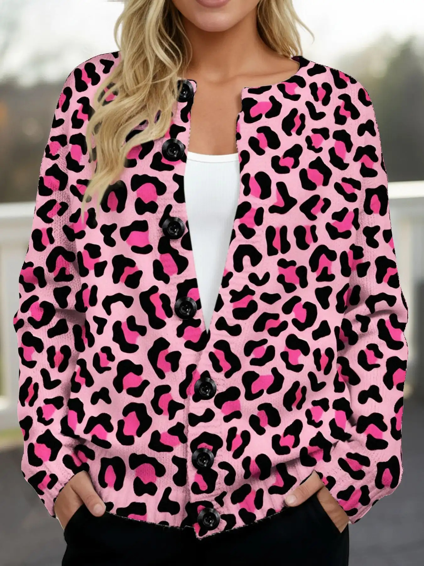 Plus Size - Women'S Plus Size Christmas Leopard Print Cardigan Sweater - Soft Button-Front Closure Coat with Round Neck & Long Sleeves, Pink & All-Over Pattern, Cozy Winter Outerwear for Holiday Parties, Casual Outfits - Ideal Christmas Gift for Wom