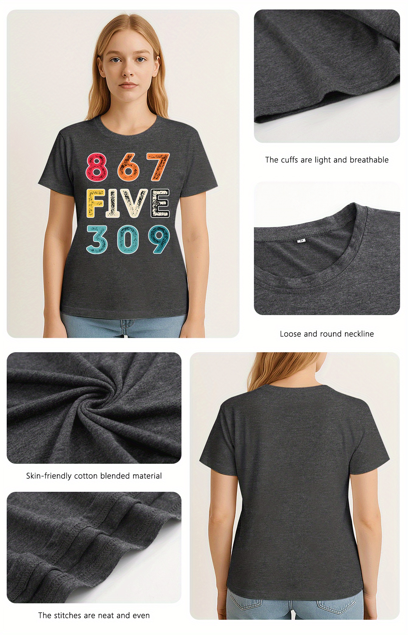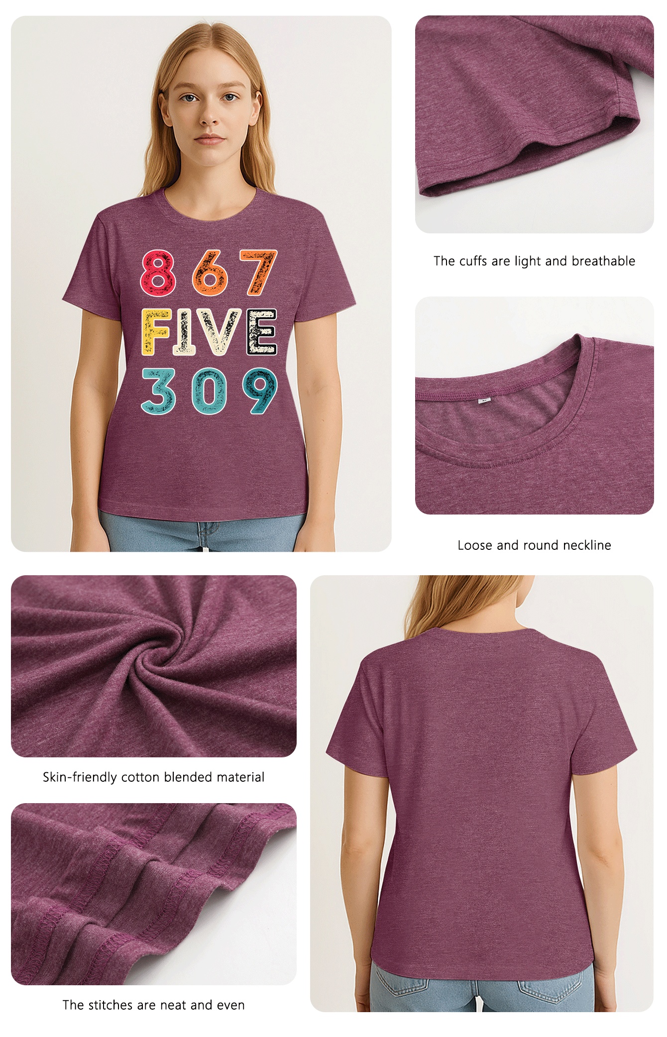 [Vibrant Graphic Tee] Vibrant Purple Women's Casual Short-Sleeve T-Shirt with Bold 867 FIVE 309 Graphic Print | Round Neck Top, Sporty Comfort Fit, Machine Washable Spring Summer Tee, Ladies T Shirts, Casual Attire, Soft Fabric