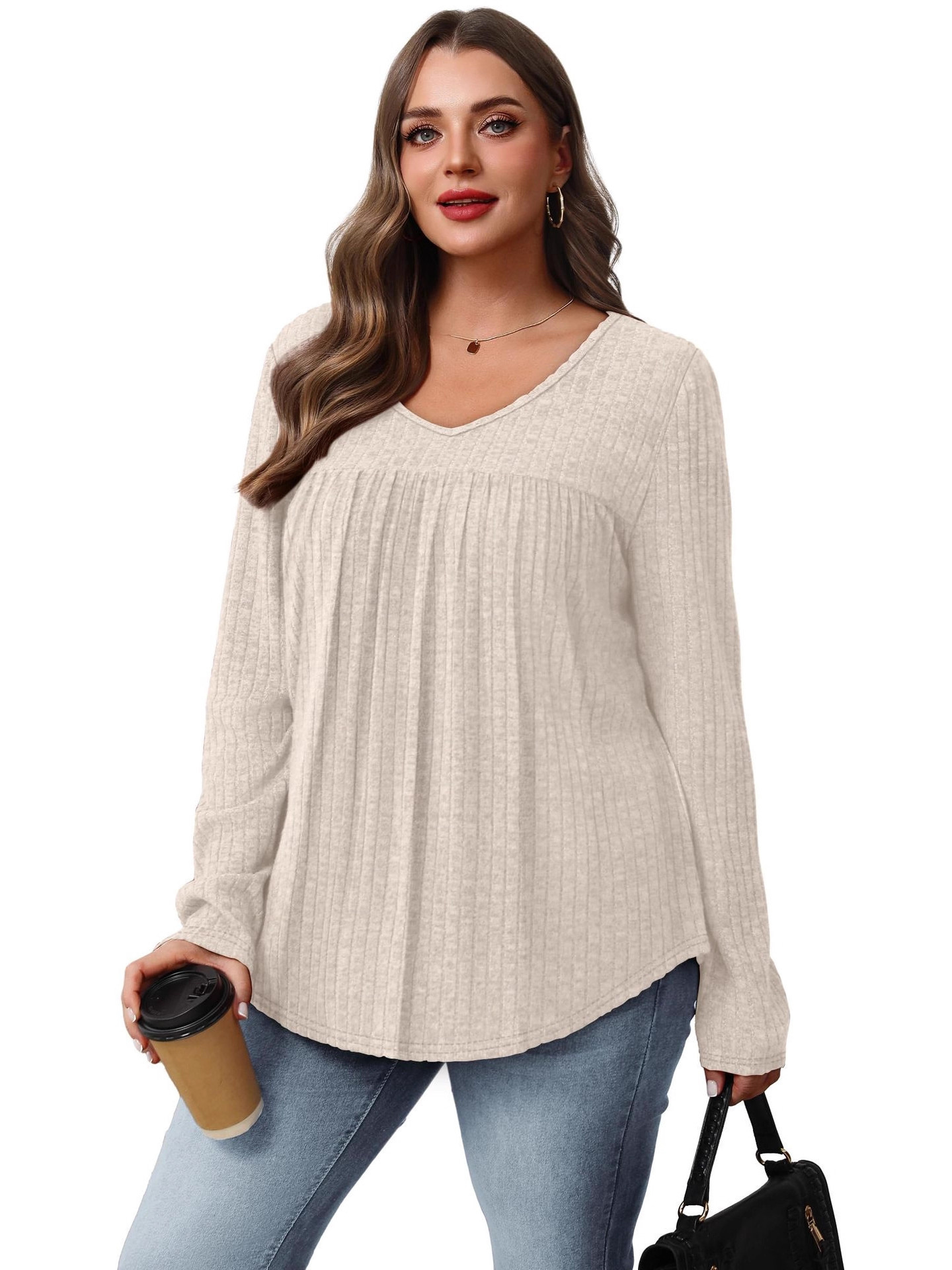 Women's 3pcs V-Neck Sweater Set - Lightweight Layering Shirts with (No Bulk), Beige/Olive /Black Solid Color Tops | Machine Washable All-Season Blouses for Casual & Semi-Formal Outfits, 95% /5% Spandex Wear