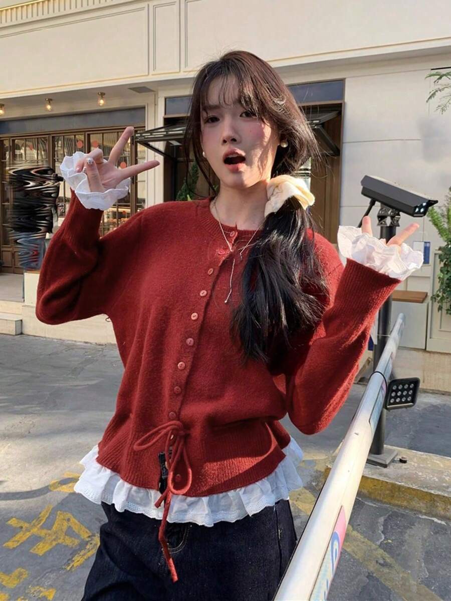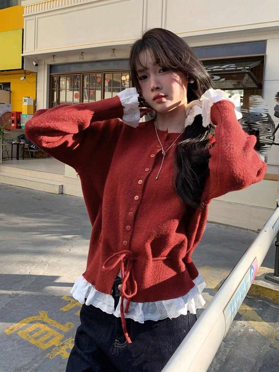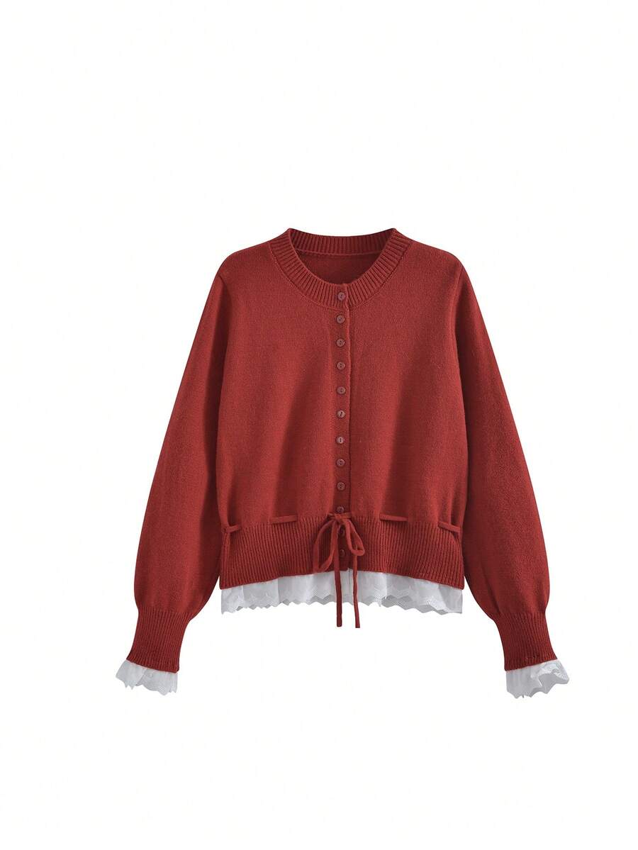 Women's Elegant Lace Patchwork & Tie Waist Loose Cardigan Sweater - Off-Shoulder/Boat Neck Jacket, Cozy Fall/Winter Outerwear, Machine Washable Layering Piece for Blouses & Trousers (Patchwork Design)