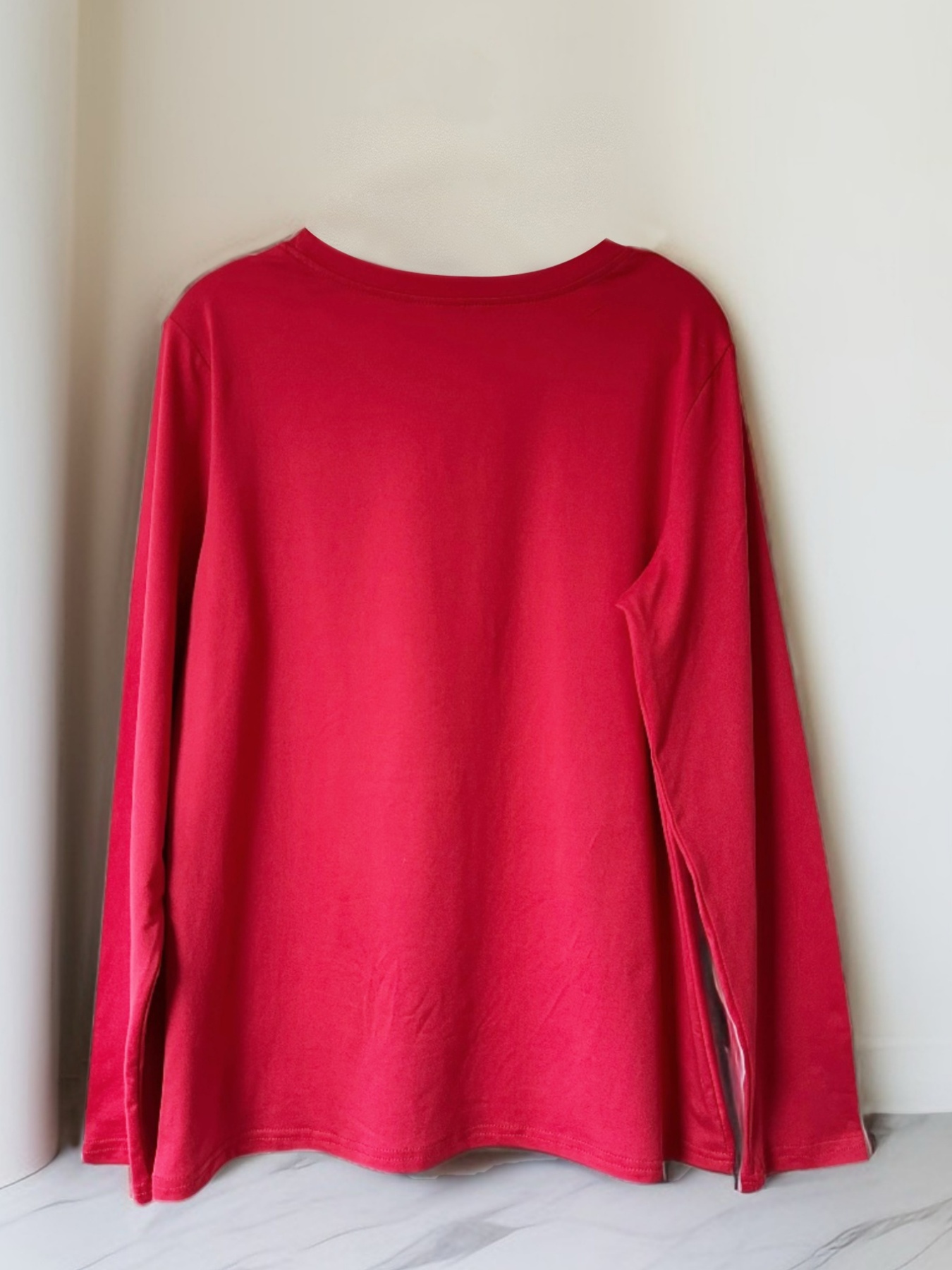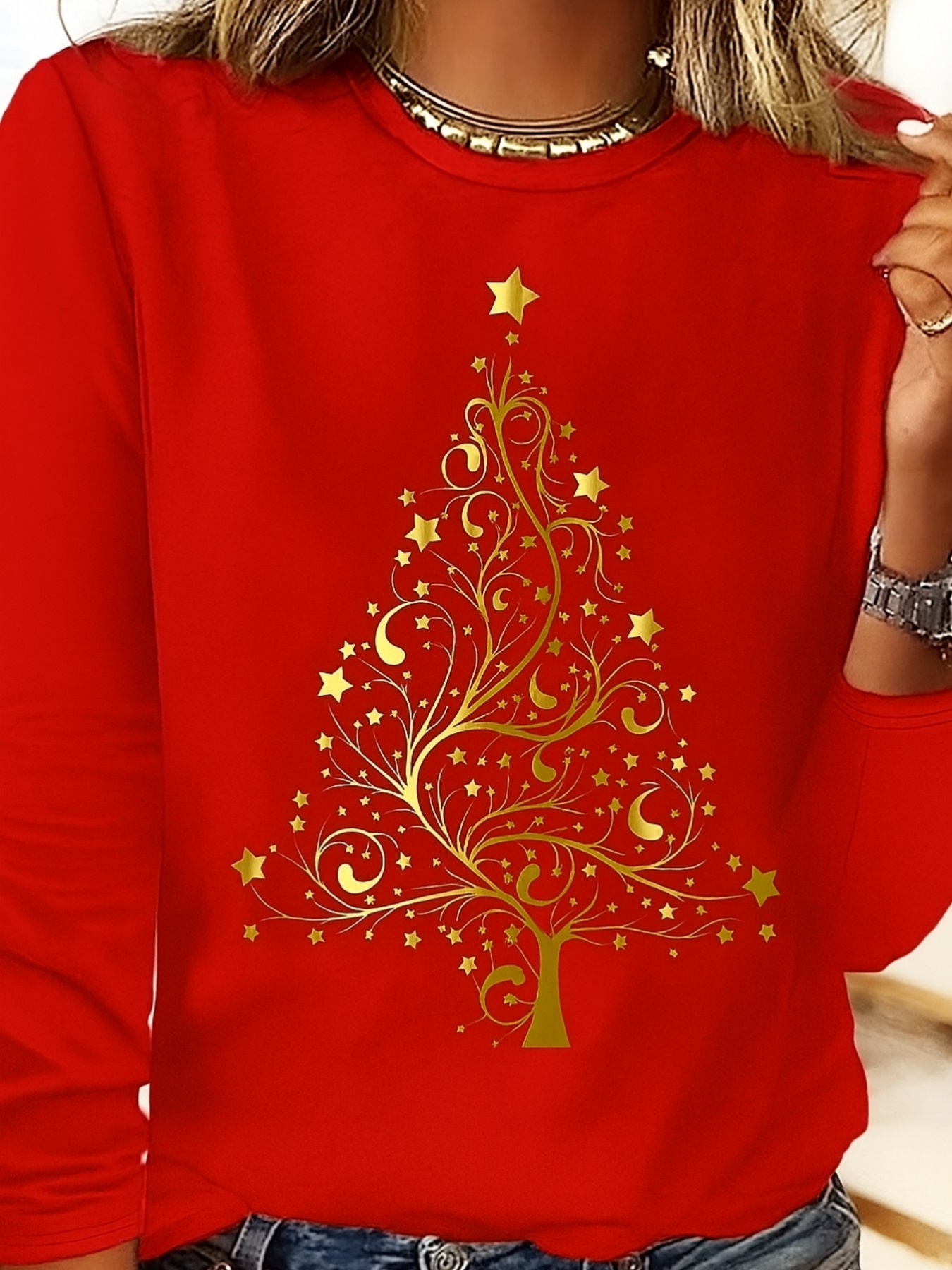 Women's Red Christmas Tree Print Long Sleeve T-Shirt - Golden Star & Swirl Holiday Top, Loose Fit Casual Round Neck Blouse for Parties, Casual Attire & Xmas Outfits (Golden/Green, All-Season)