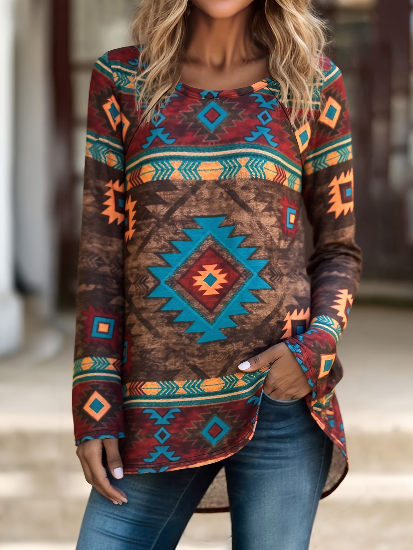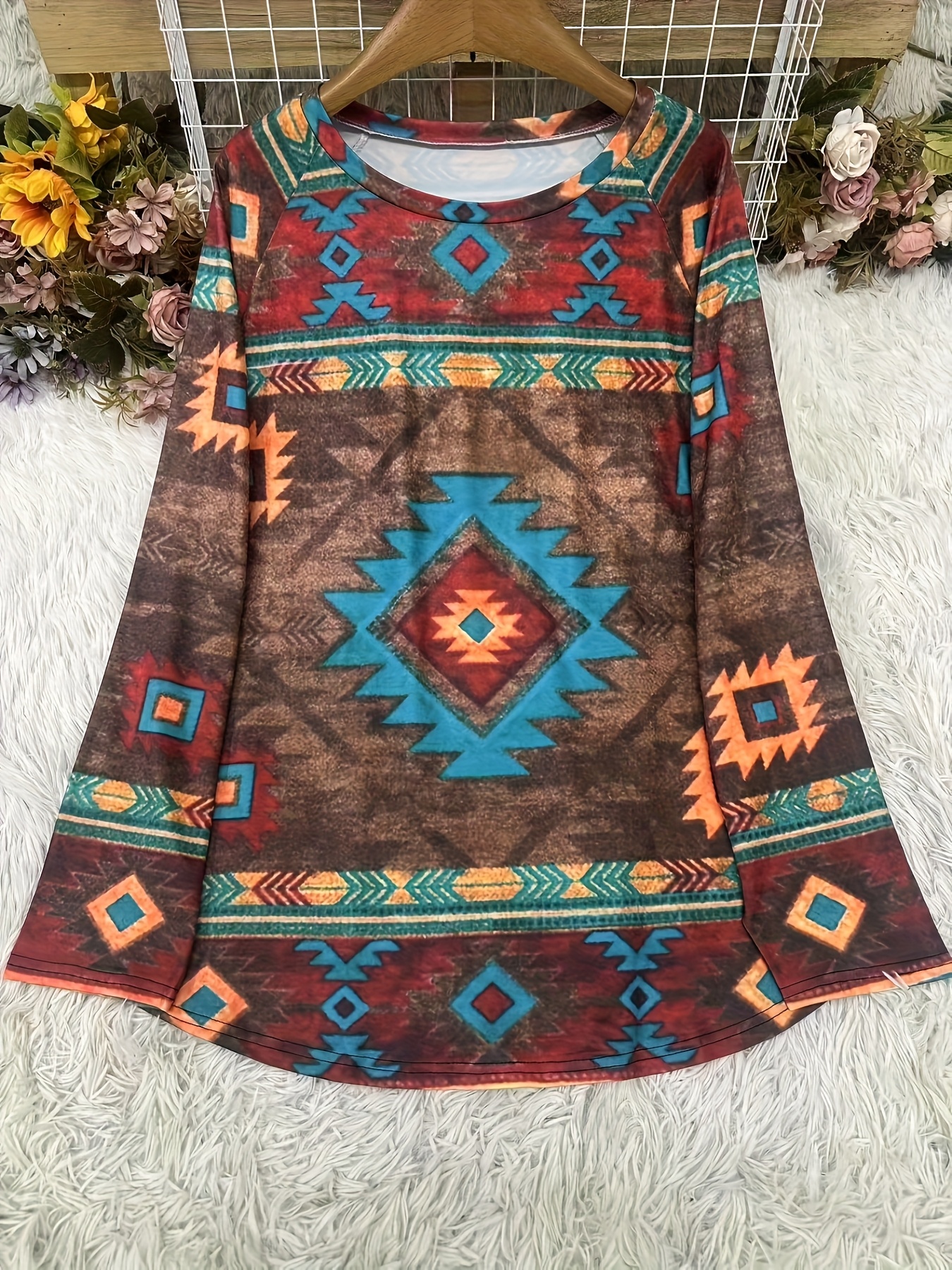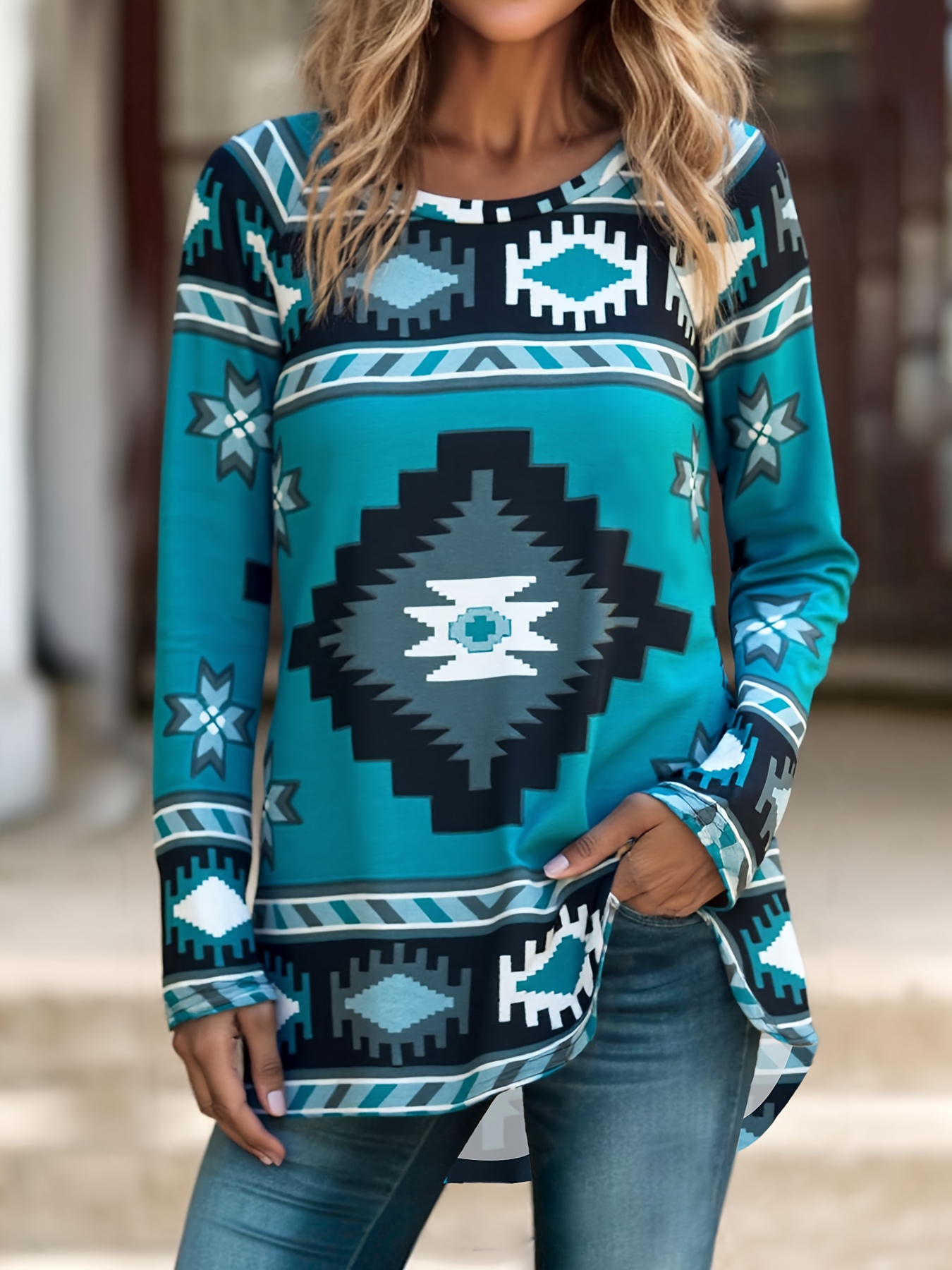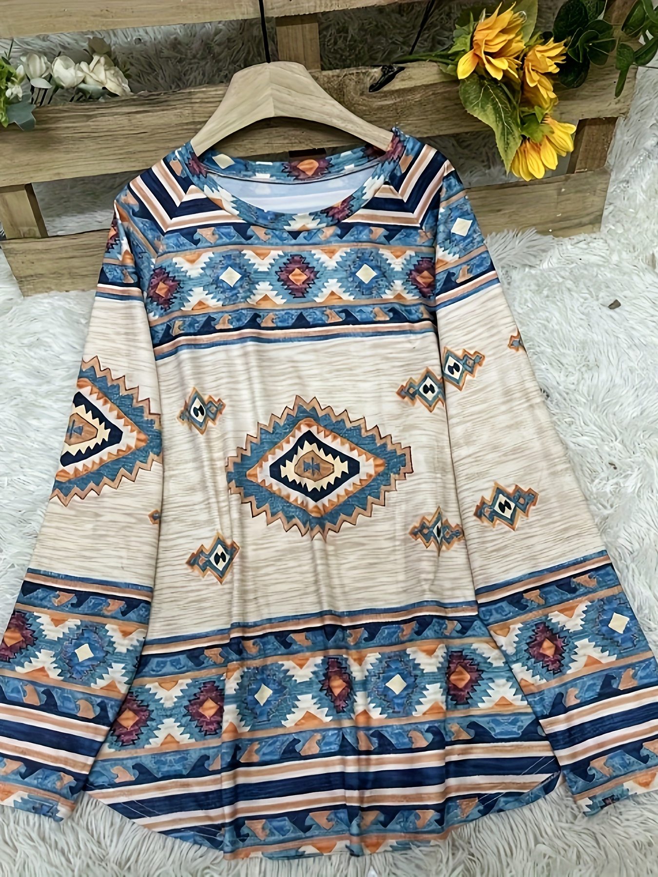 Women'S Southwest-Style Geometric Print Long-Sleeve Top - Elastic V-Neck Casual Shirt, Machine Washable Translucent Fabric with Turquoise/Orange/Black/Beige/White/Gray Patterns, Resort Wear & Everyday Elegant Blouse for Fall Winter Layering, Southwestern Bohemian Style Clothing, Regular Fit with Intricate Geometric Design, Stretchy Material for Comfort, Spring/Summer Wear, Pullover Style with Long Sleeves, Women Top And Blouse, V Neck T Shirt For Women, Fall Shirt For Women, White Top