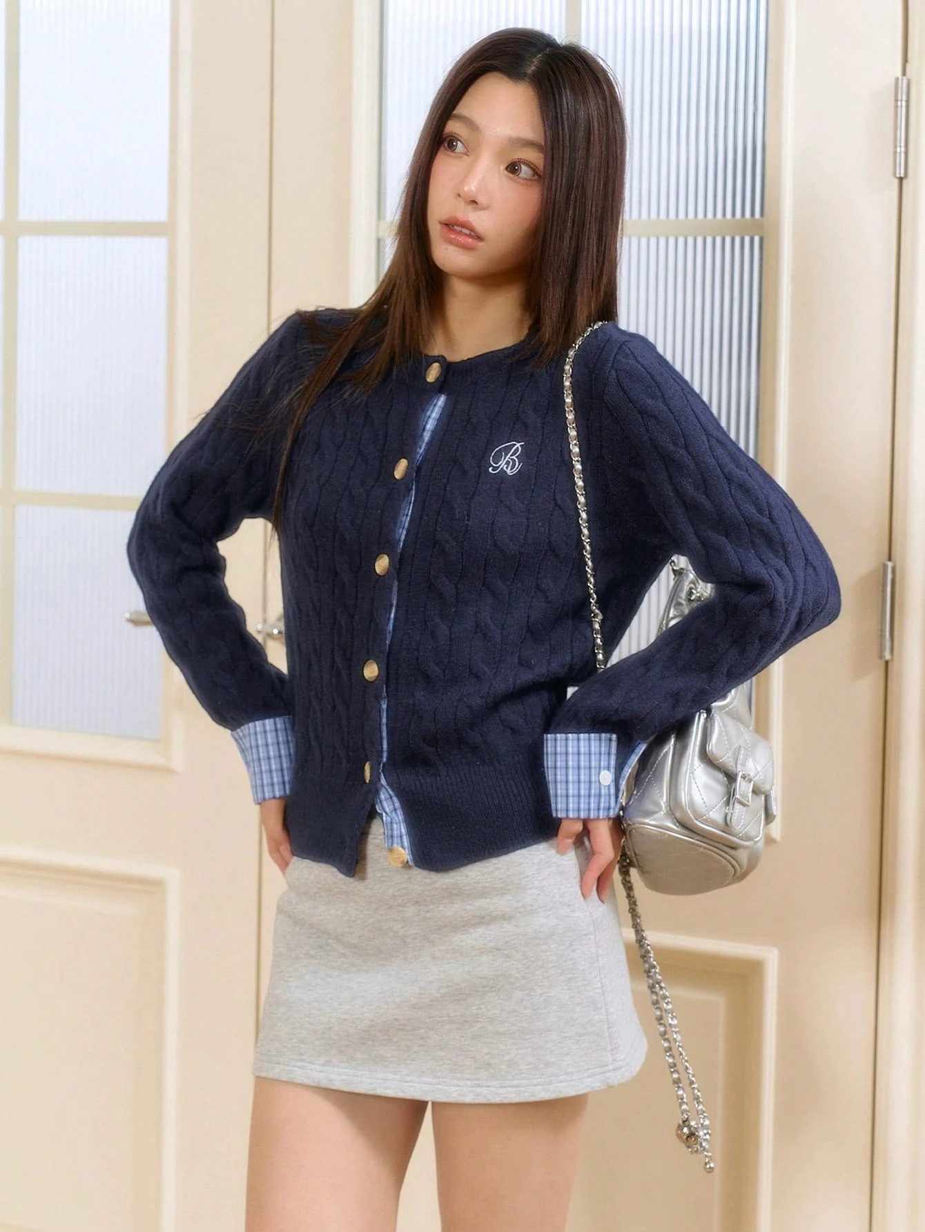 Women's Winter Cardigan Sweater - Off-Shoulder/Boat Neck Collegiate Style Color Block Plaid Patchwork Jacket, Machine Washable Patchwork Sweaters for Layering (Autumn/Winter)